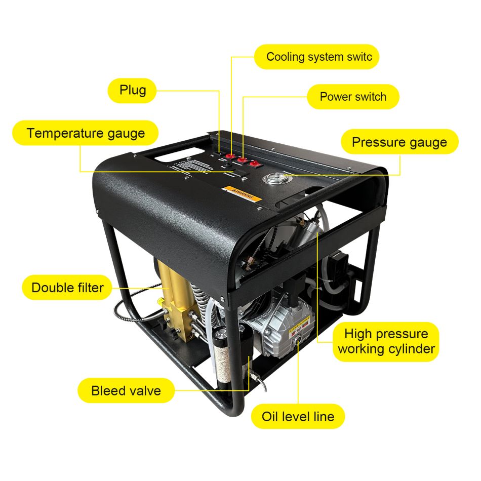 TUXING TXEDT033 4500Psi 300Bar Auto Stop and Auto Purge Air CompressorAir compressor power :110V/60HZ ; Working pressure: 310BAR/ 30MPA/ 4500PSI,High pressure air pump inflating speed: 2800r/min.