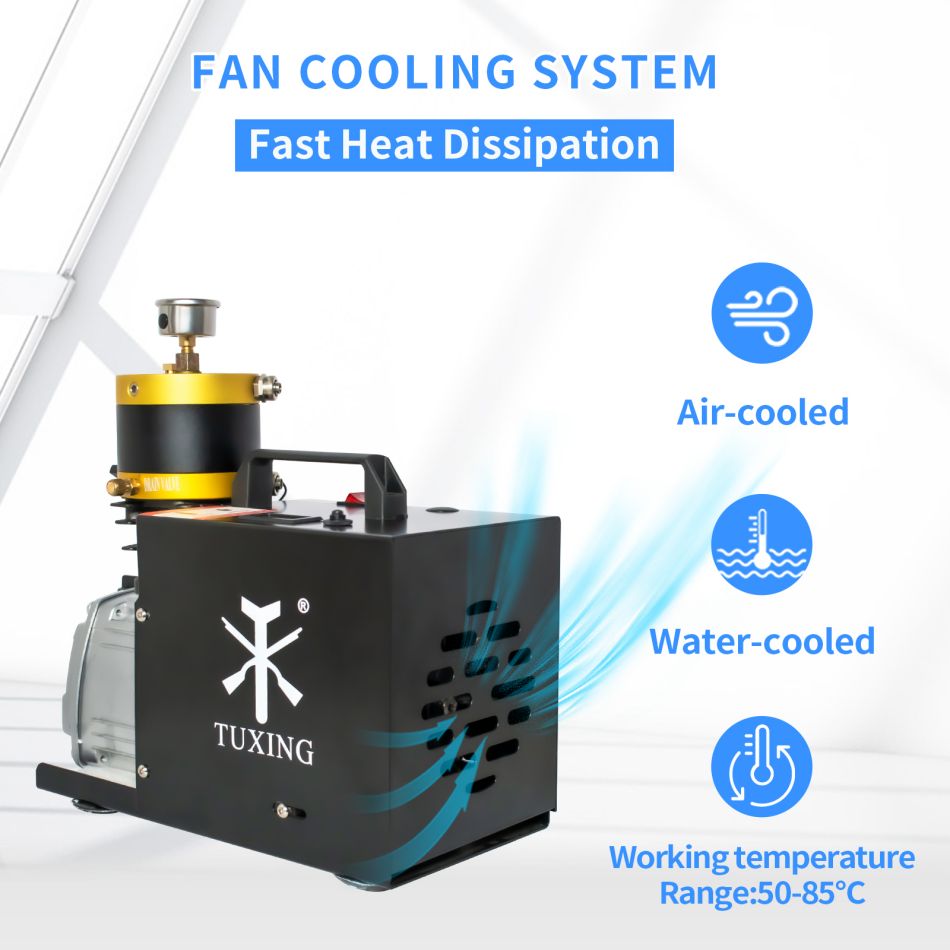 This pcp/scuba compressor features oil and water separator filtration. Clean air will be discharged by the machine, suitable for the mini diving bottle, PCP devices, paintball tank, leakage detecting, fire fighting, pressure-tight test, air impermeability test, etc.