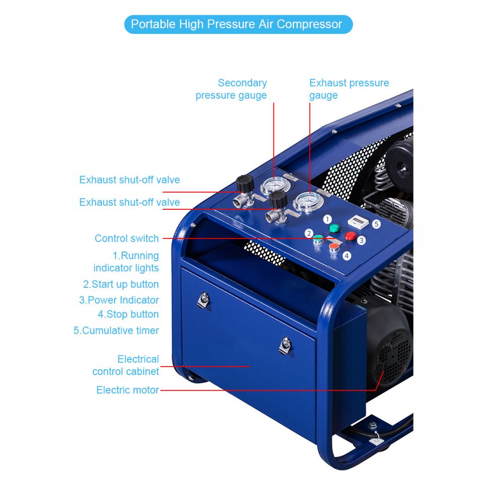 TUXING TX12 High Pressure 200L 300BAR 4500PSI Scuba Diving Air Compressor1. It has Auto Stop and Auto Timing functions.